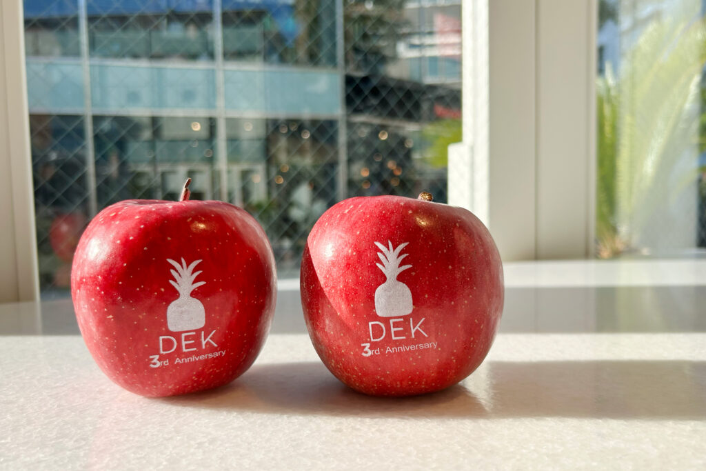 感謝の気持ちを込めて、2月7日(土)より、店内にてご飲食いただいたお客様を対象に、先着300名様へDEKロゴ入りの《3周年記念りんご》をプレゼントいたします。